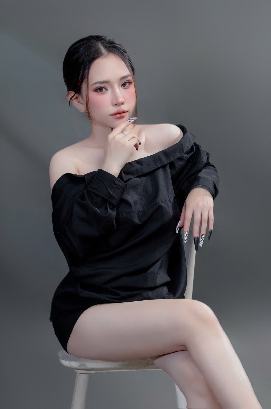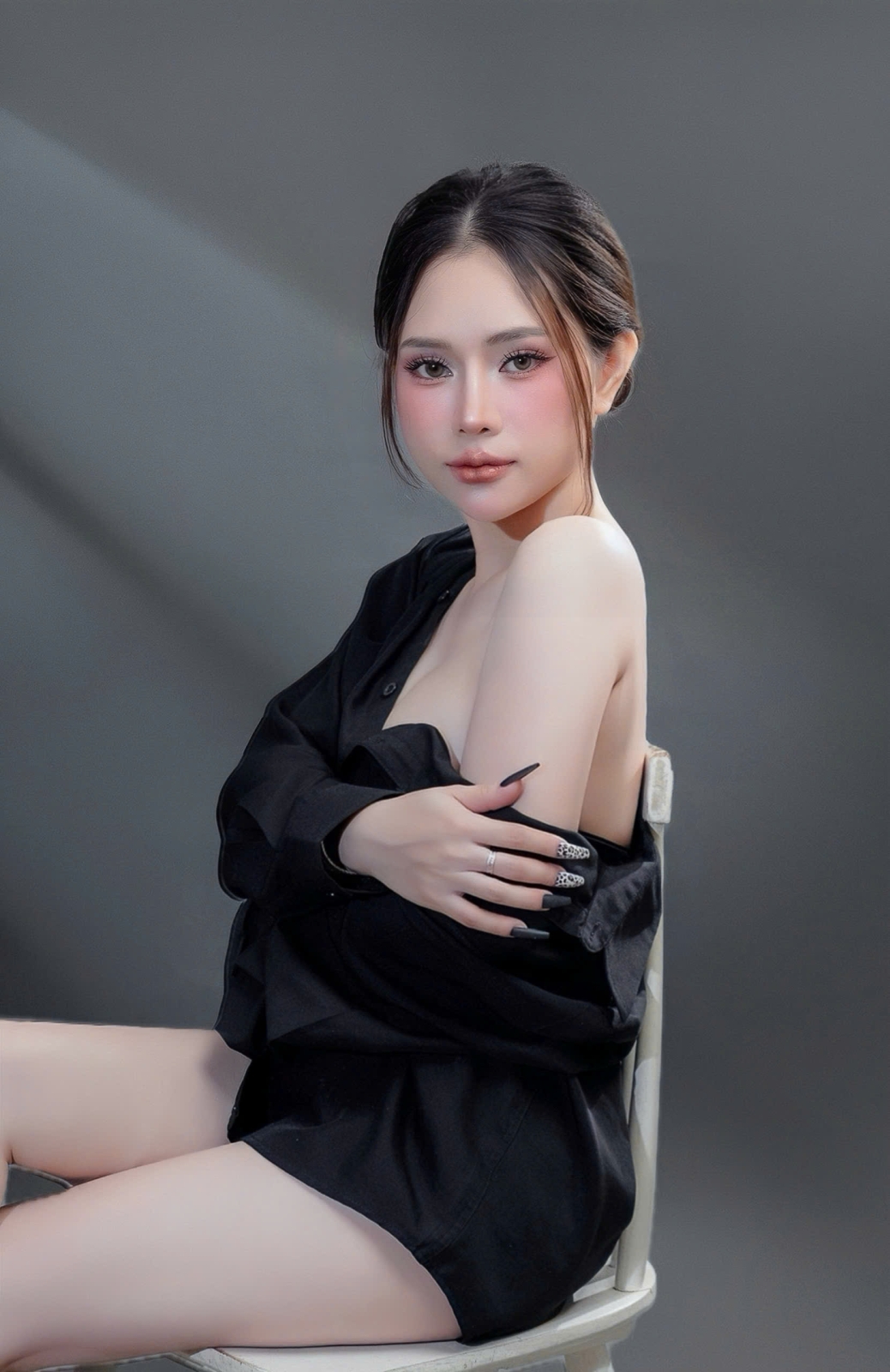 Một chiếc áo sơ mi ngủ màu đen, một layout makeup clean girl trong veo nhưng vẫn đầy sức hút — concept này không cần quá nhiều chi tiết để nổi bật, vì sự quyến rũ nằm ở thần thái.