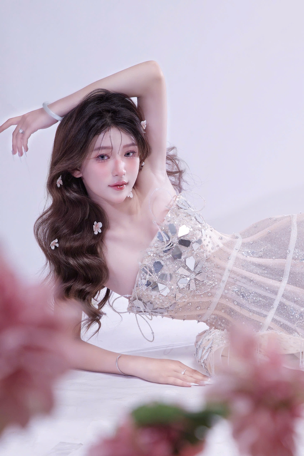 Một nàng thơ nằm khẽ giữa không gian nhẹ tênh, mái tóc dài gợn sóng buông mềm như mây, tất cả tạo nên cảm giác vừa ngọt ngào vừa trong trẻo. Tone hồng không rực rỡ mà dịu dàng, đủ để tôn lên nét nữ tính mong manh và đáng yêu theo cách rất tự nhiên.