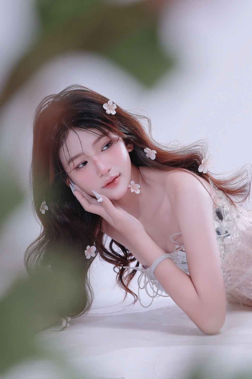 Layout makeup được giữ mỏng nhẹ, làn da căng trong, đôi môi hồng xinh và ánh mắt mềm như một giấc mơ. Concept này không cần quá nhiều điểm nhấn, bởi chính sự nhẹ nhàng lại là điều khiến nàng trở nên cuốn hút nhất.