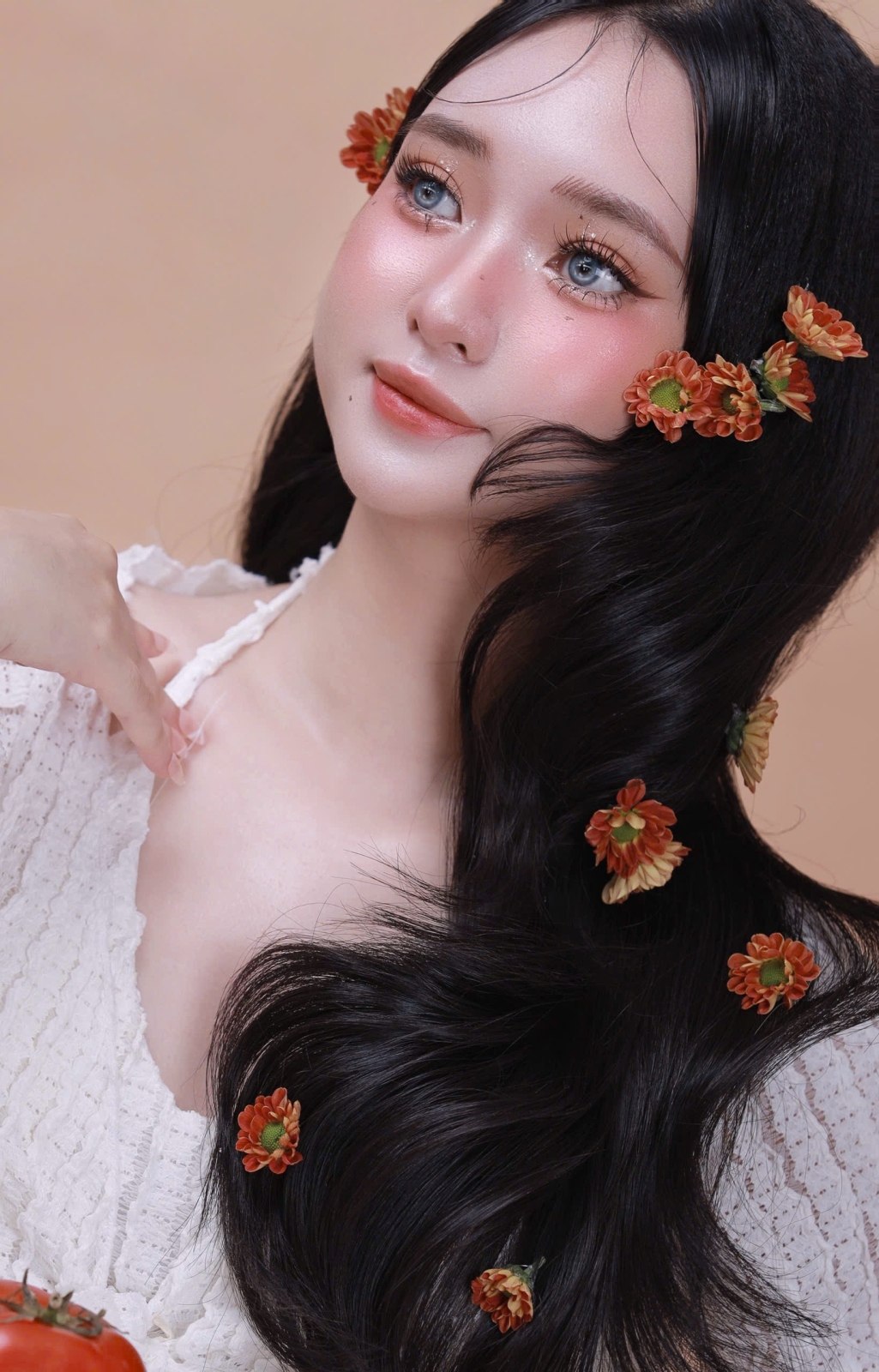 Makeup được xử lý theo phong cách beauty classic: làn da mịn như sứ, ánh mắt long lanh, đôi môi căng mọng tự nhiên, tôn vinh đường nét gương mặt một cách nhẹ nhàng và chuẩn mực. Mái tóc đen uốn sóng mềm kết hợp cùng chất liệu ren trắng tạo nên tổng thể thanh lịch, gợi nhắc vẻ đẹp vượt thời gian của những nàng thơ châu Âu.