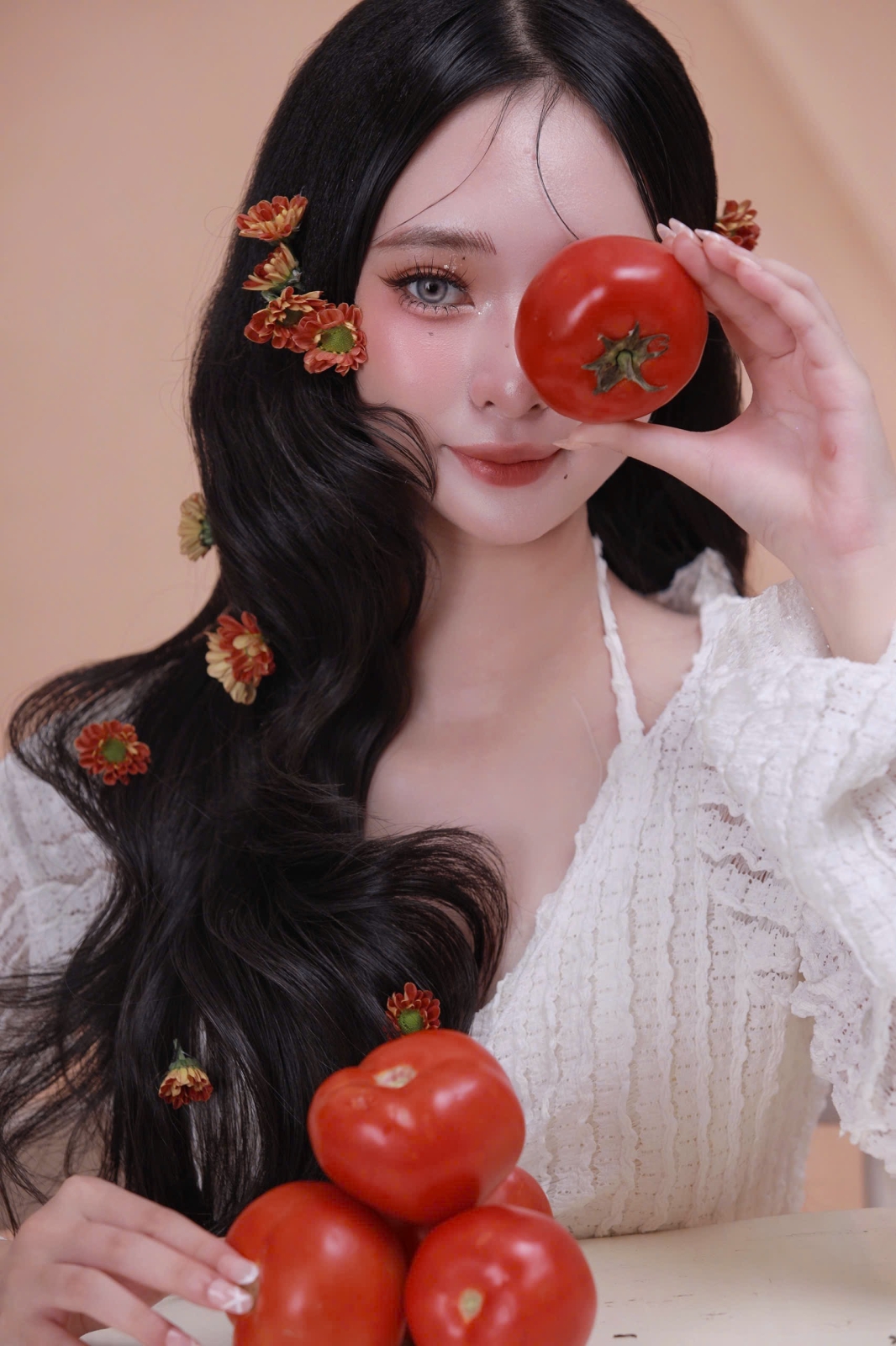 Lấy cảm hứng từ vẻ đẹp cổ điển và sự nữ tính thuần khiết, Scarlet Innocence là sự giao thoa tinh tế giữa sắc đỏ trầm ấm và làn da trong veo, mềm mại. Điểm nhấn màu đỏ của trái chín và hoa cài tóc mang tính biểu tượng cho sức sống, sự nữ tính và nét quyến rũ kín đáo — một vẻ đẹp không phô trương nhưng đầy cuốn hút.