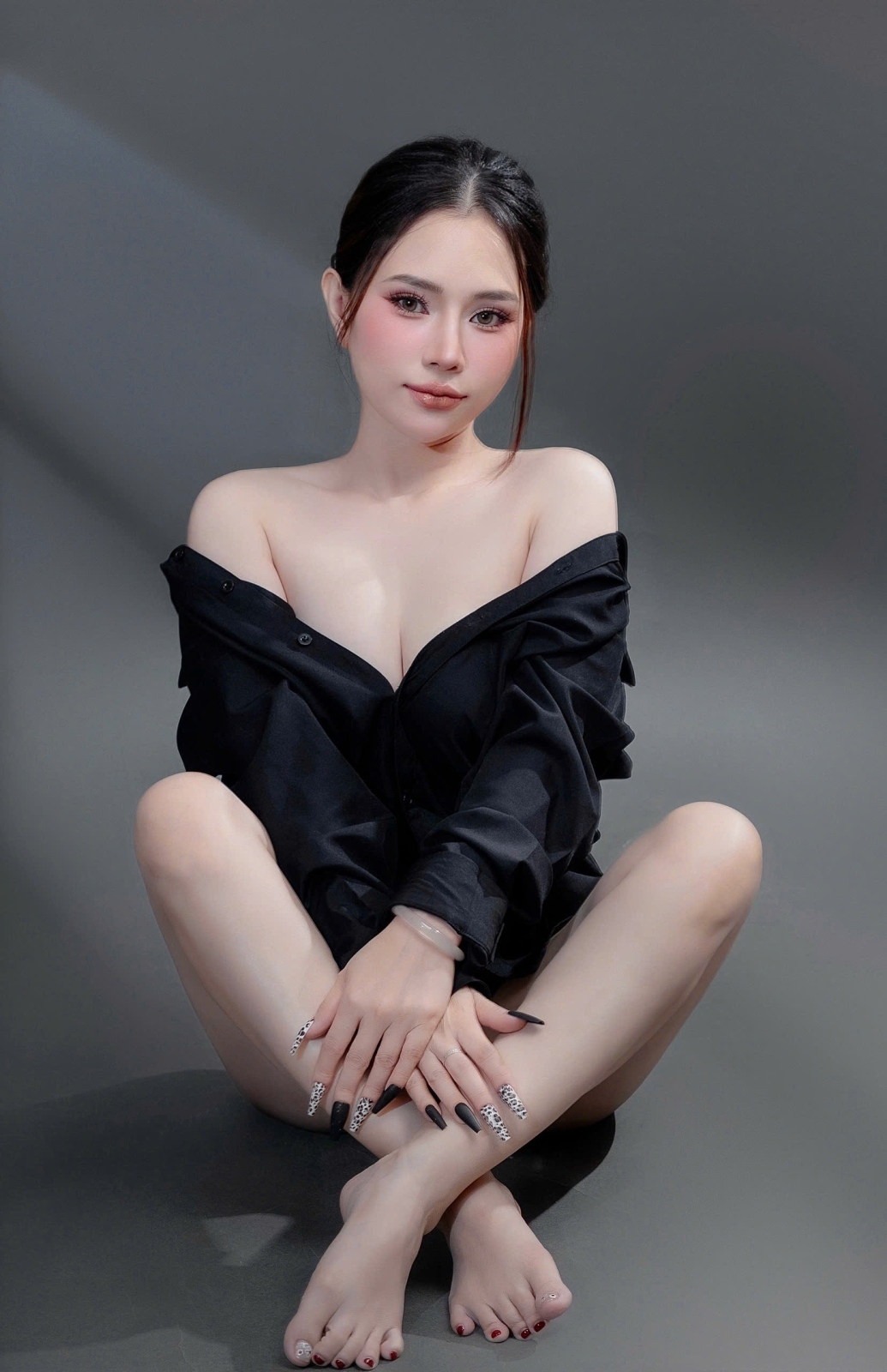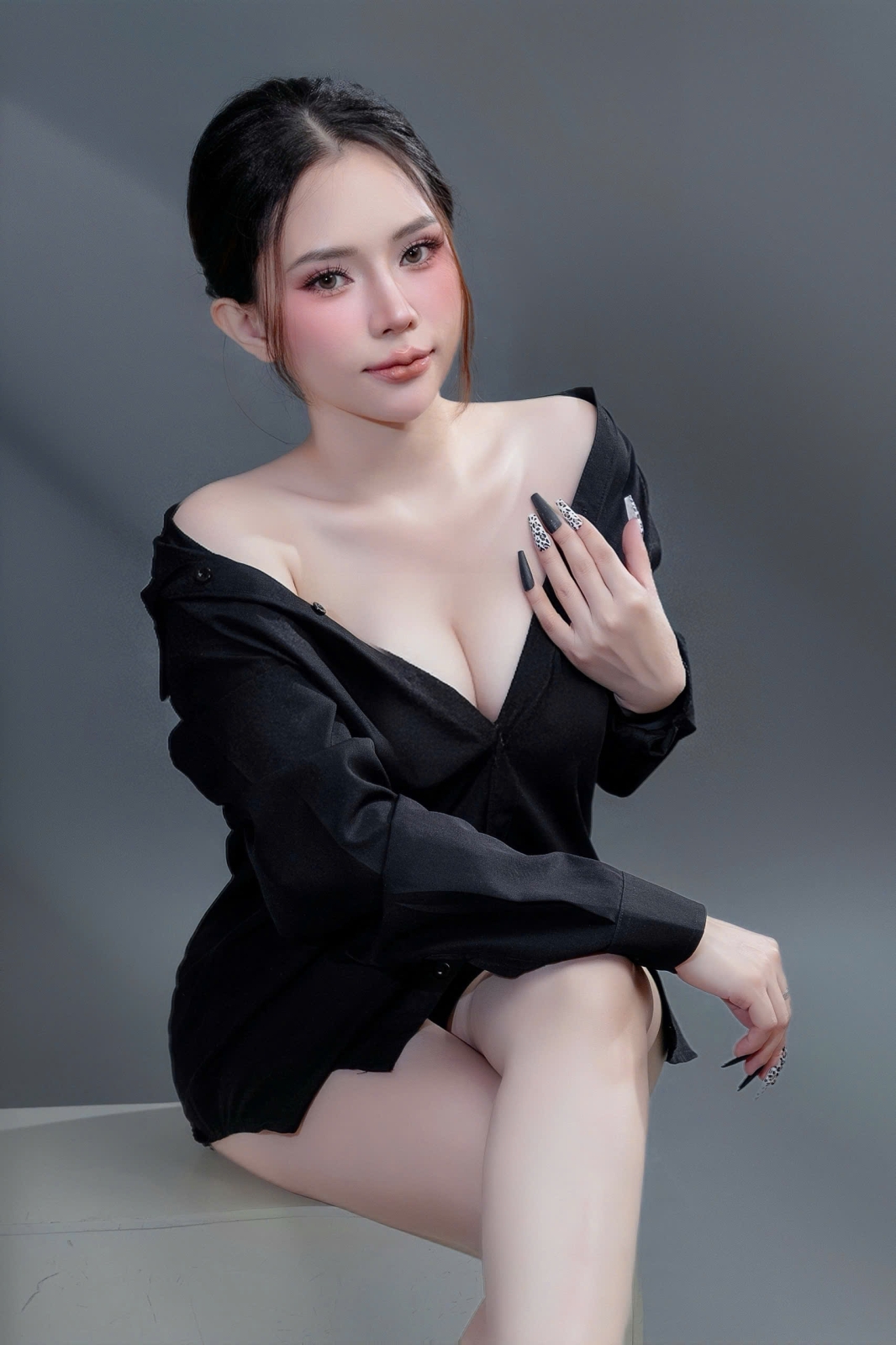 Một chiếc áo sơ mi ngủ màu đen, một layout makeup clean girl trong veo nhưng vẫn đầy sức hút — concept này không cần quá nhiều chi tiết để nổi bật, vì sự quyến rũ nằm ở thần thái.