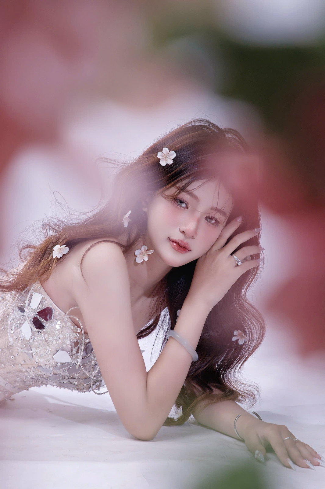 Một nàng thơ nằm khẽ giữa không gian nhẹ tênh, mái tóc dài gợn sóng buông mềm như mây, tất cả tạo nên cảm giác vừa ngọt ngào vừa trong trẻo. Tone hồng không rực rỡ mà dịu dàng, đủ để tôn lên nét nữ tính mong manh và đáng yêu theo cách rất tự nhiên.